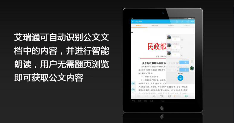 艾瑞通智慧政府一体化协同办公平台最大的特点就是“人性化”,公文的查阅通过平台的语音朗读功能即可轻松实现。艾瑞通智慧政府一体化协同办公平台的将语音识别技术融入公文管理当中,将公文通过语音朗读的形式进行播报,用户无需守在屏幕前,就可以轻松获取公文内容。