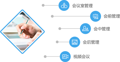 通过会议室管理、会前管理、会中管理、会后管理、 视频会议五个部分,将会议的整个生命周期纳入平台, 实现一人办会的会议管理新模式